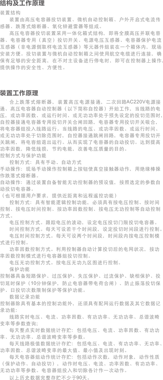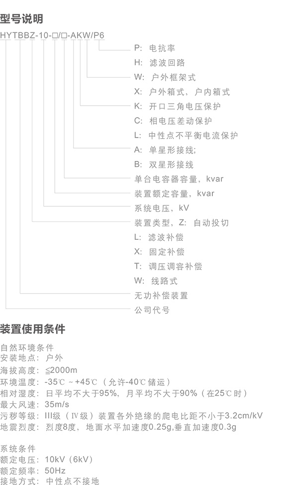 HYTBBW系列高壓線路無功補償智能裝置,主要適用在10kV(或6kV)配電線路上和用戶端,可安裝在架空線路線桿上,最高工作電壓12kV。作為提高功率因數,降低線路損耗,節約電能,改善電壓質量之用。實現對無功量的自動補償,使電能質量和補償數量達到最佳值。也可以用于小型化終端變電所10kV(或6kV)母線無功補償。