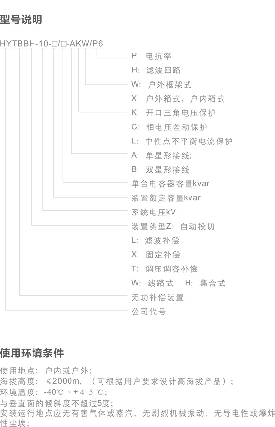 HYTBBH系列框架式高壓無功補償成套裝置用于6kV、10kV、 35kV系統,并聯于電力系統進行無功補償,以提高電網的功率因數, 降低供電變壓器及輸送線路的損耗,提高供電效率,改善供電環境,增 加輸變電設備的輸送能力。