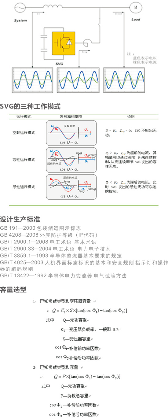 HYSVG靜止無功發生器(又稱SVG)的基本原理是將自換相橋式電 路通過電抗器直接并聯在電網上,適當地調節橋式電路交流側輸出電 壓的相位和幅值或者直接控制其交流側電流,就可以使該電路發出滿 足要求的無功電流,實現動態無功補償的目的。