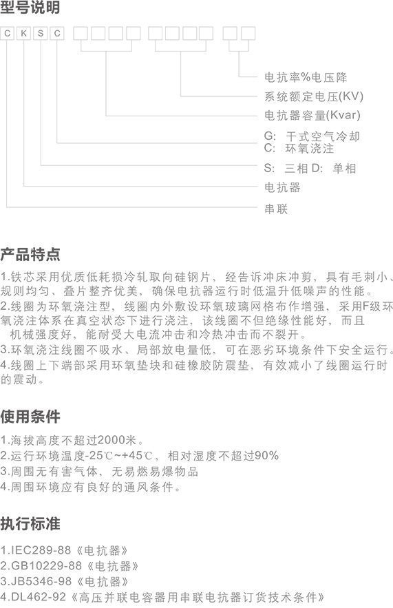 CKSC型鐵芯高壓電抗器主要用于6KV~10KV電力系統(tǒng)與高壓電容器 組串聯(lián),能夠有效的抑制和吸收高次諧波,限制合閘涌流及操作過(guò)電壓, 保護(hù)電容器組,改善系統(tǒng)的電壓波形,提高電網(wǎng)功率因數(shù)。